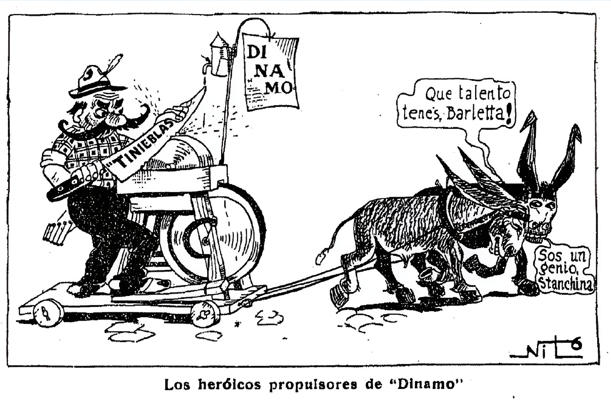 La imagen muestra a Elías Castelnuovo accionando una muela a pedal mientras afila una cuchilla rotulada «TINIEBLAS», título de su libro de cuentos publicado en 1923. De un pequeño mástil cuelga un banderín con la leyenda «DI NA MO», que recrea la portada de la revista. El conjunto está montado sobre una plataforma con ruedas tirada por dos burros identificados como Leónidas Barletta y Lorenzo Stanchina, que se elogian entre sí diciendo: «¡Qué talento tenés, Barletta!» y «Sos un genio, Stanchina».